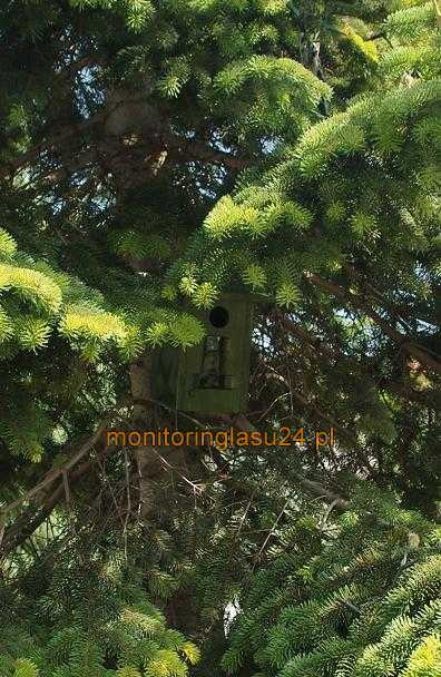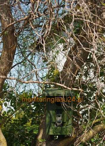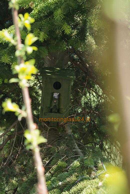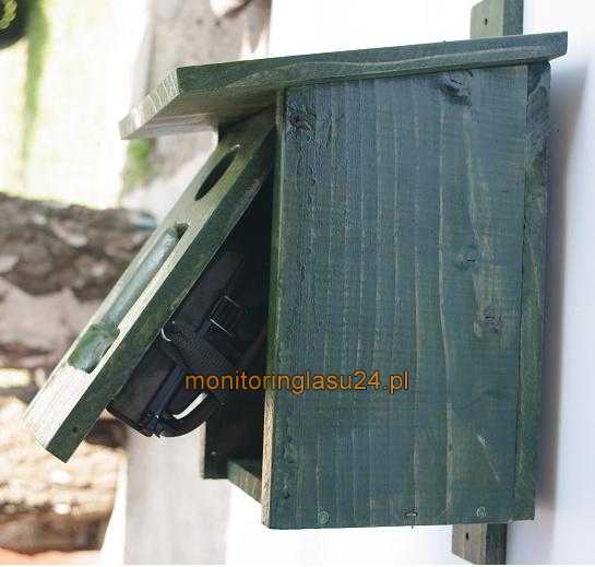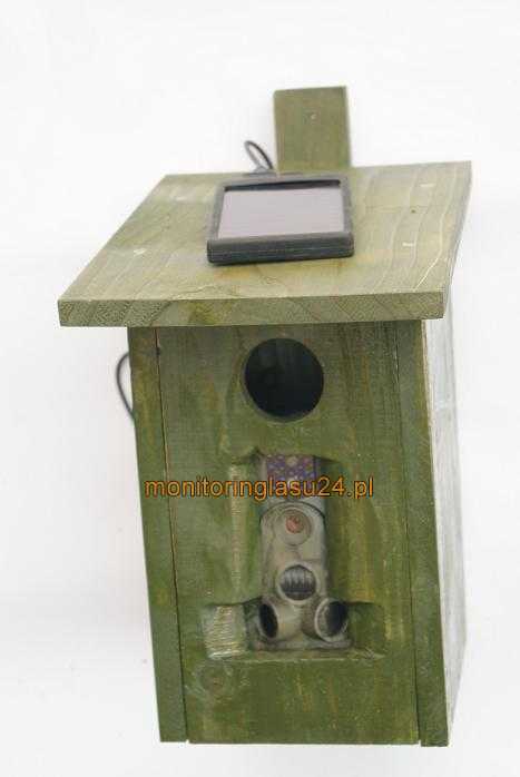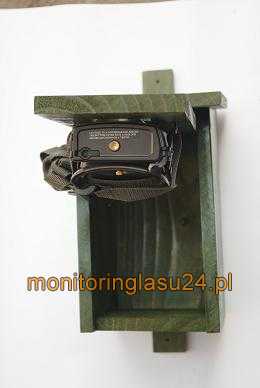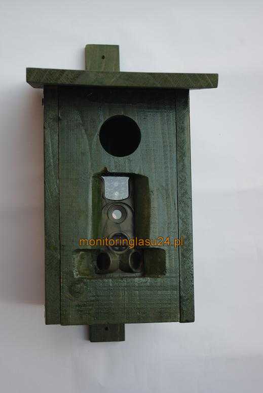 Budka lęgowa do maskowania kamery. Całość jest starannie wykonana z suchego modrzewia o grubości 15mm. Budka jest otwierana. Kamerę mocuje się za pomocą troka do uchwytów na wewnętrznej stronie przedniej ścianki. W tylniej ściance budki niewielki otwor do wyprowadzenia przewodu zasilania solarnego. W opcji z solarem na daszku budki zamocowany uchwyt solara.